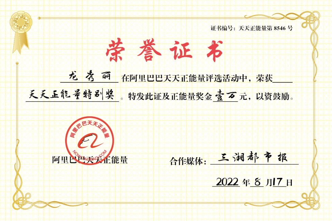阿里巴巴天天正能量联合三湘都市报授予龙秀丽天天正能量特别奖及一万元奖金